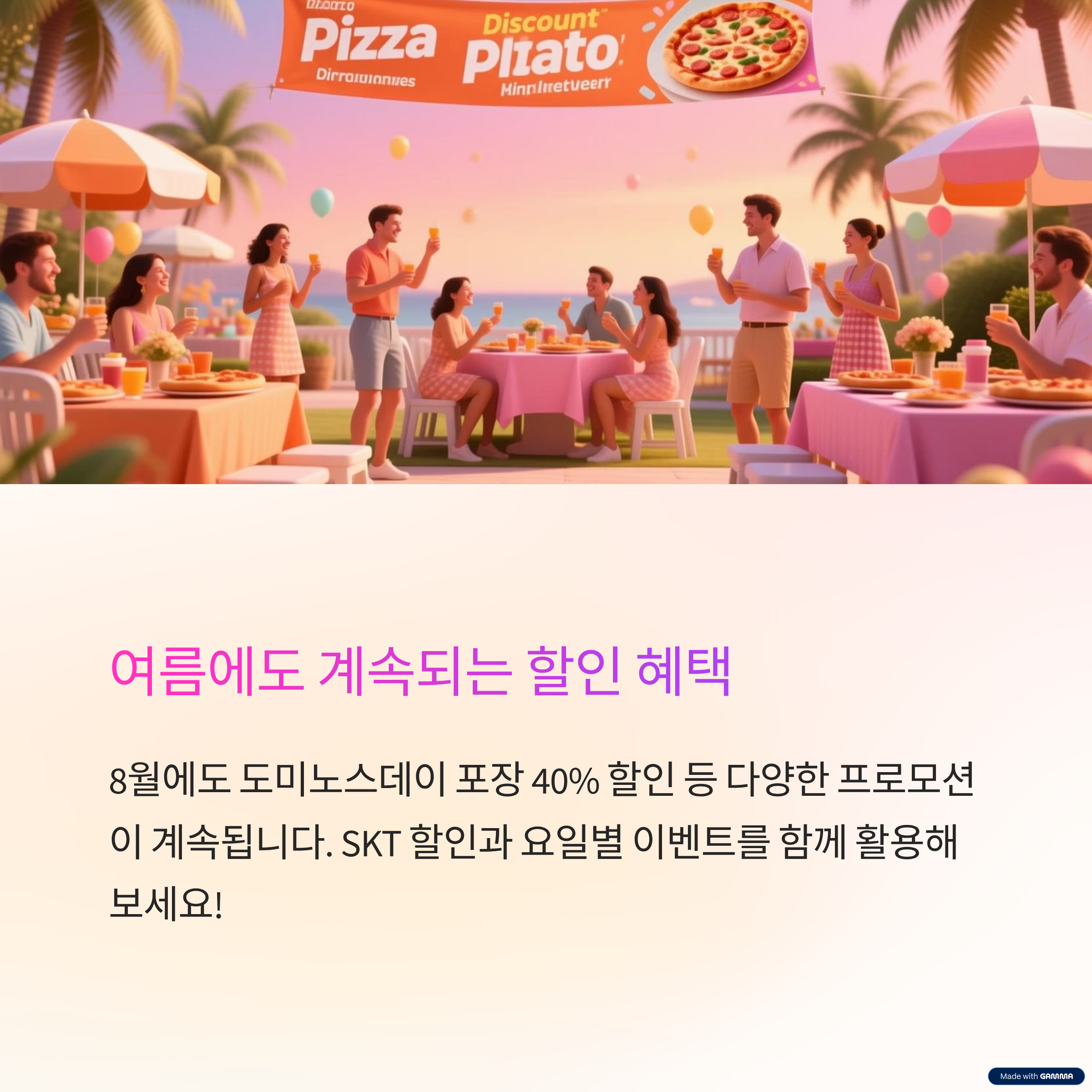 8월 여름에도 도미노스데이 포장 40% 할인처럼 다양한 프로모션이 이어지고 있습니다. 따라서 SKT 할인과 별도로 주중이나 특정 요일 이벤트까지 챙기면 언제든지 합리적인 가격으로 피자를 즐길 수 있습니다.