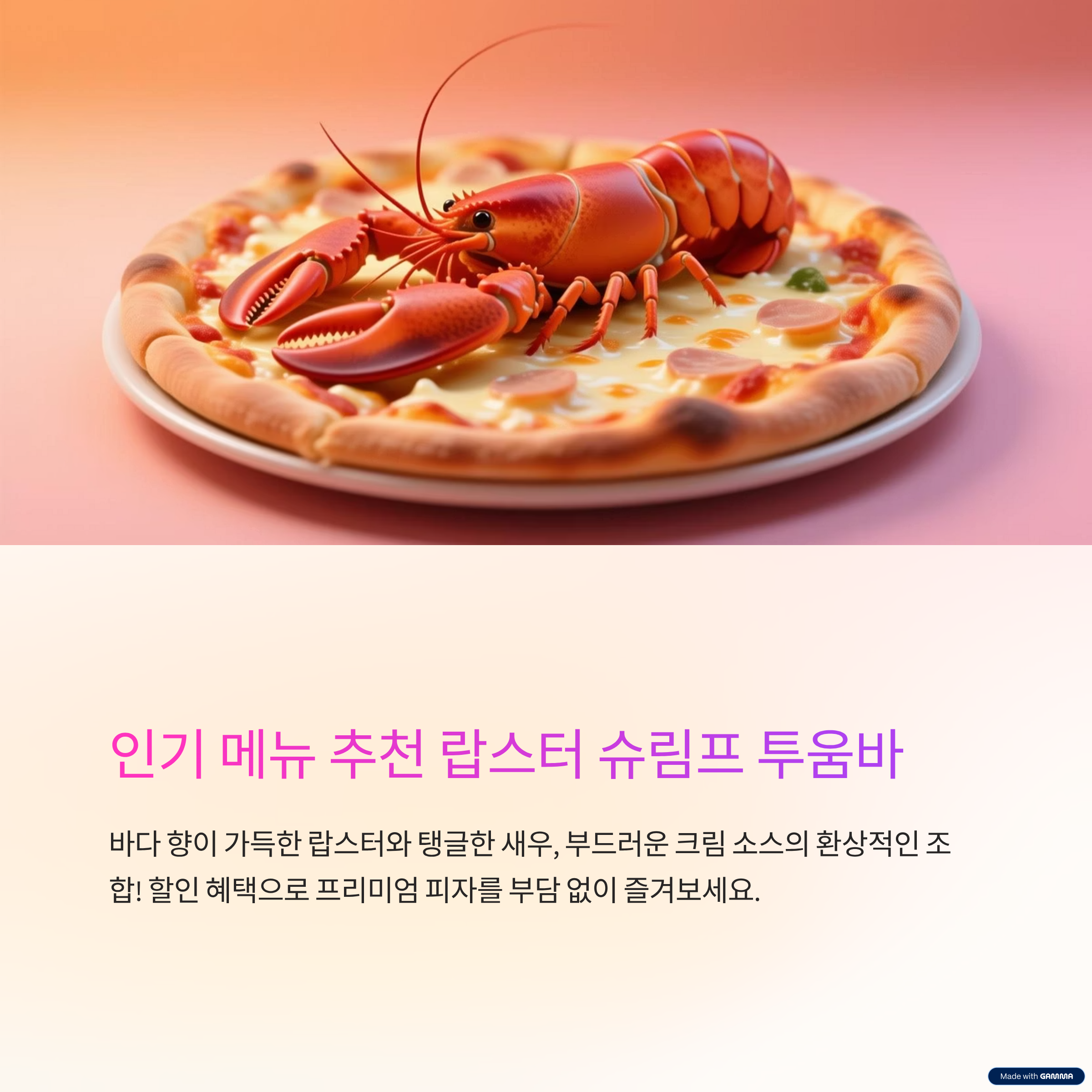 고객들이 가장 많이 찾는 메뉴 중 하나가 랍스터 슈림프 투움바입니다. 바다 향이 가득한 랍스터와 탱글한 새우, 부드러운 크림 소스가 어우러져 풍미가 압도적이에요. 특히 할인 혜택을 적용하면 프리미엄 피자를 부담 없이 즐길 수 있습니다.
