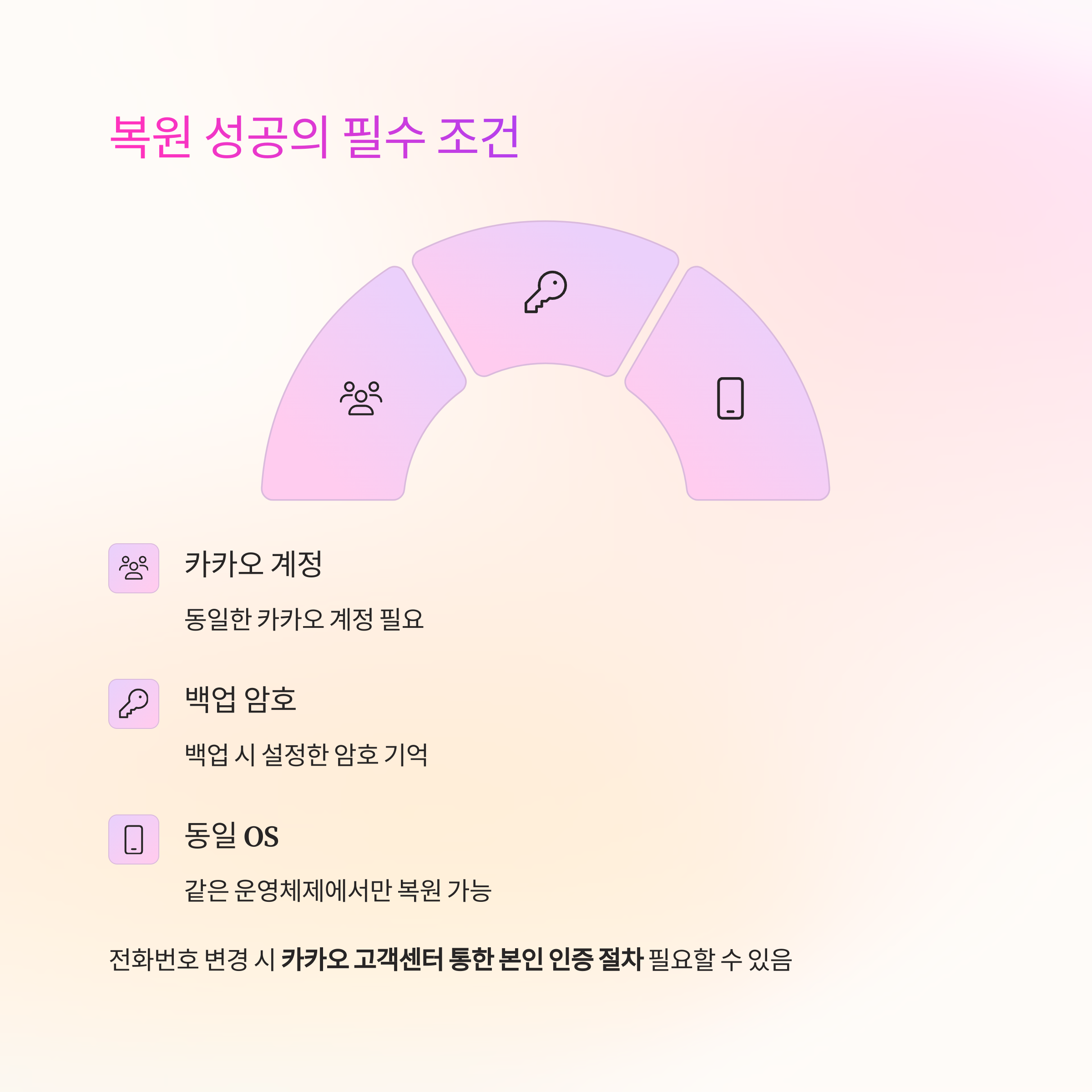 카카오 계정 + 백업 암호 + 동일 OS 조건이 충족되어야 대화 복원이 가능합니다.