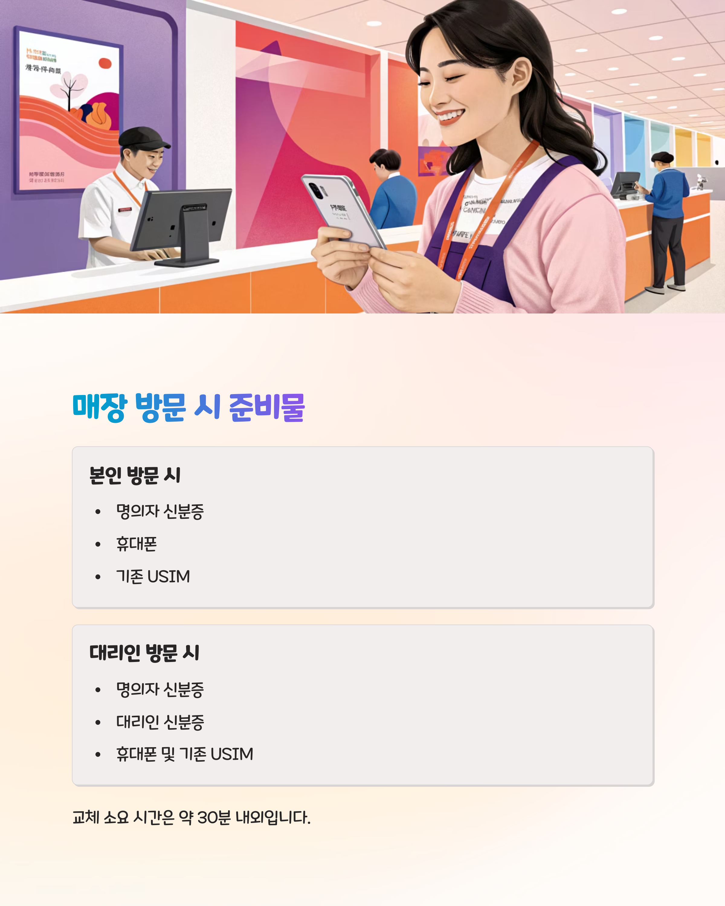 교체는 본인 인증과 유심 발급 절차를 거치며, 평균 소요 시간은 약 30분입니다.