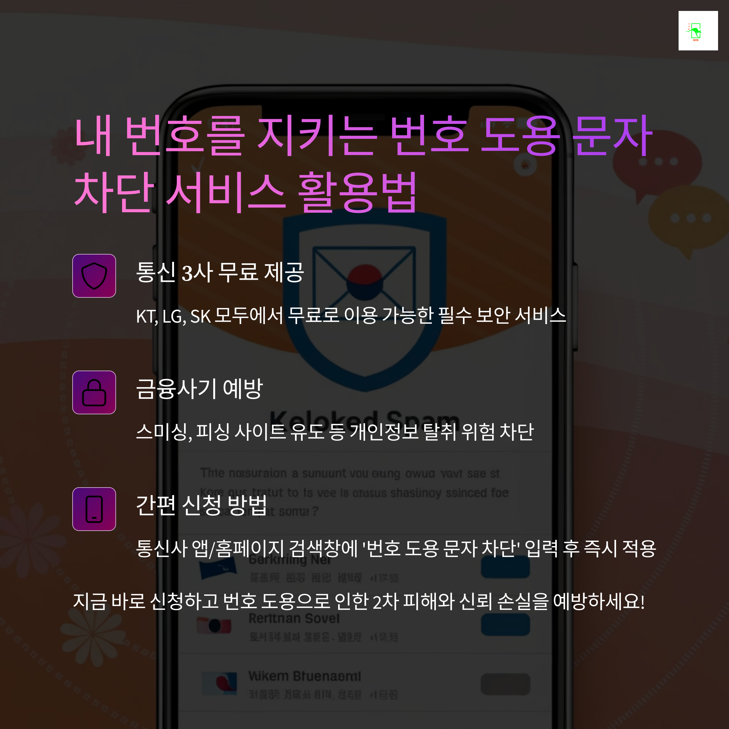 번호 도용 문자 차단 서비스를 통해 내 번호로 발송되는 스팸/스미싱 문자를 차단할 수 있습니다.