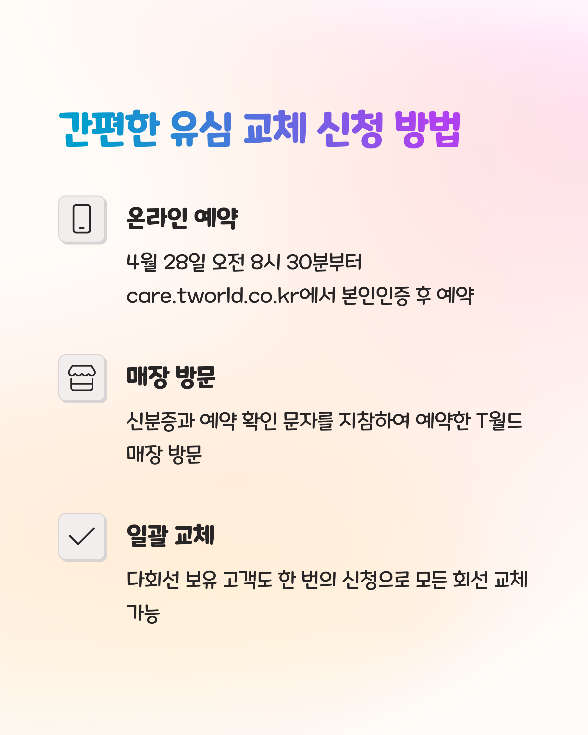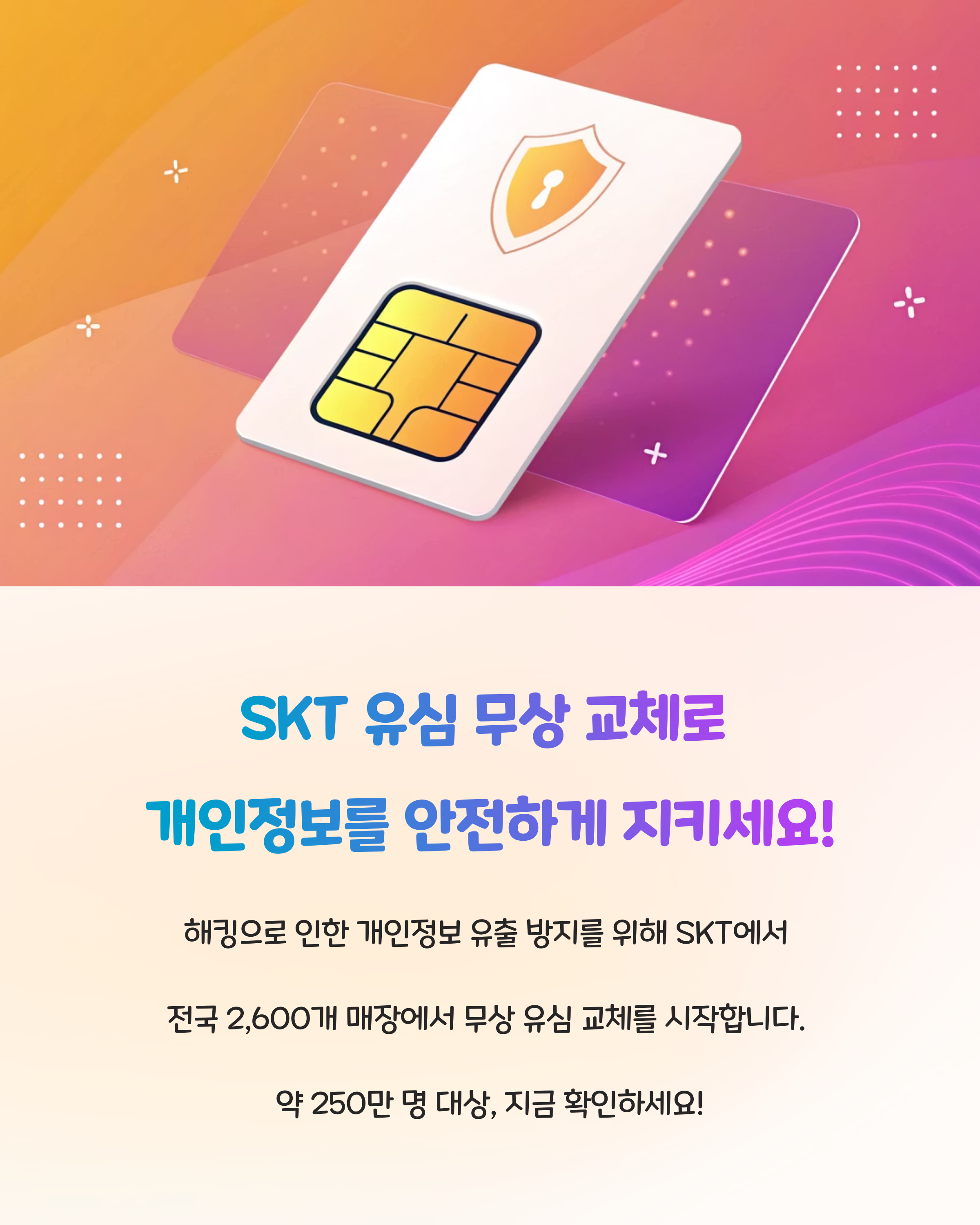 SKT 유심 정보 유출 사고로 인해 전 고객 무상 교체가 시작되었습니다. 놓치면 개인정보까지 위험할 수 있습니다. 10분이면 끝나는 예방 방법부터 간단한 신청, 지금 바로 진행하세요!